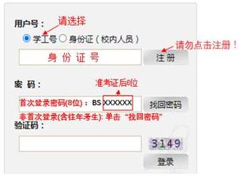 财务处”,在“业务办理”中选“学生缴费”。考生账号已开通,切勿自行注册。复试收费标准:80元/生(仅申请考核考生,硕博连读考生无须缴费)。用户号选择“学工号”,输入正确的身份证号。缴费系统初始密码(8位)为大写字母“BS”加准考证编号后6位(准考证查看网址://yzgmis.91sqpian.com/zsgl/bswb/login.aspx),如“BS123456”。非首次登录缴费系统的考生(含往年报考考生及误注册考生)使用“找回密码”,登录并缴费。