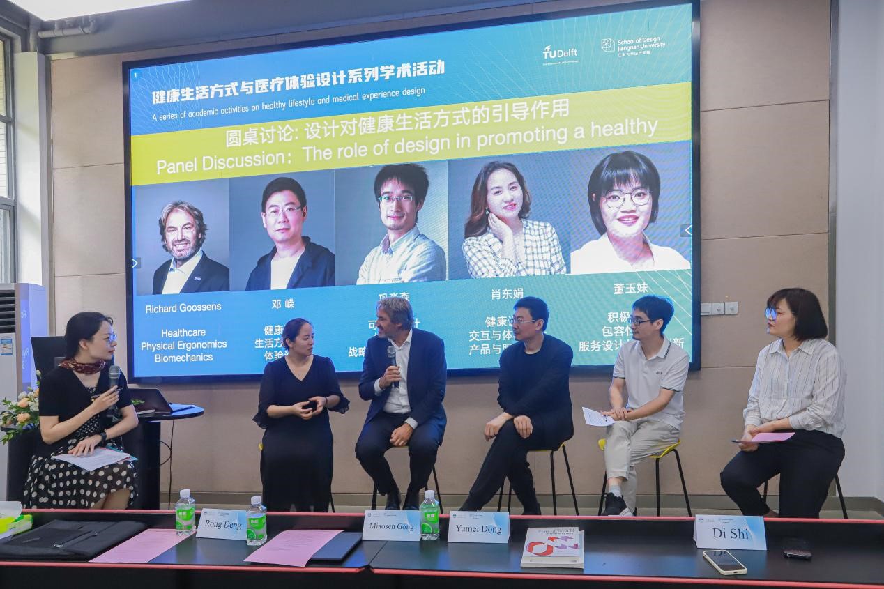 随后的圆桌讨论由时迪副教授担任学术主持,Richard Goossens教授、邓嵘教授、巩淼森副教授、肖东娟副教授、以及董玉妹副教授作为嘉宾参与讨论。巩淼森副教授针对中西方健康生活方式及医学理念的异同点进行了探讨,认为西方强调科学医疗工业技术;而东方中医注重天人合人、康养理疗养身,但二者随着文化碰撞正在有机融合。肖东娟副教授针对在实施健康设计项目时,就遇到不同学科之间交流和合作的困难点进行了分享,认为掌握不同学科语言、学科连接能力尤为重要;在整个健康系统中设计不仅只针对外观功能和界面设计,还可以优化流程体验。邓嵘教授与Richard Goossens教授在两校健康设计人才培养问题进行了交流讨论,强调该方向学生应该更多的到用户场景实地体验、洞察真实的需求、掌握多学科的语言、同时要加强对产品功能原理的理解。最后巩淼森副教授与董玉妹副教授就健康设计与服务系统关联提出了独到的见解,认为服务设计在健康领域的应用可以促进健康行为的改变和健康习惯的养成,可以更好地满足用户的健康需求。