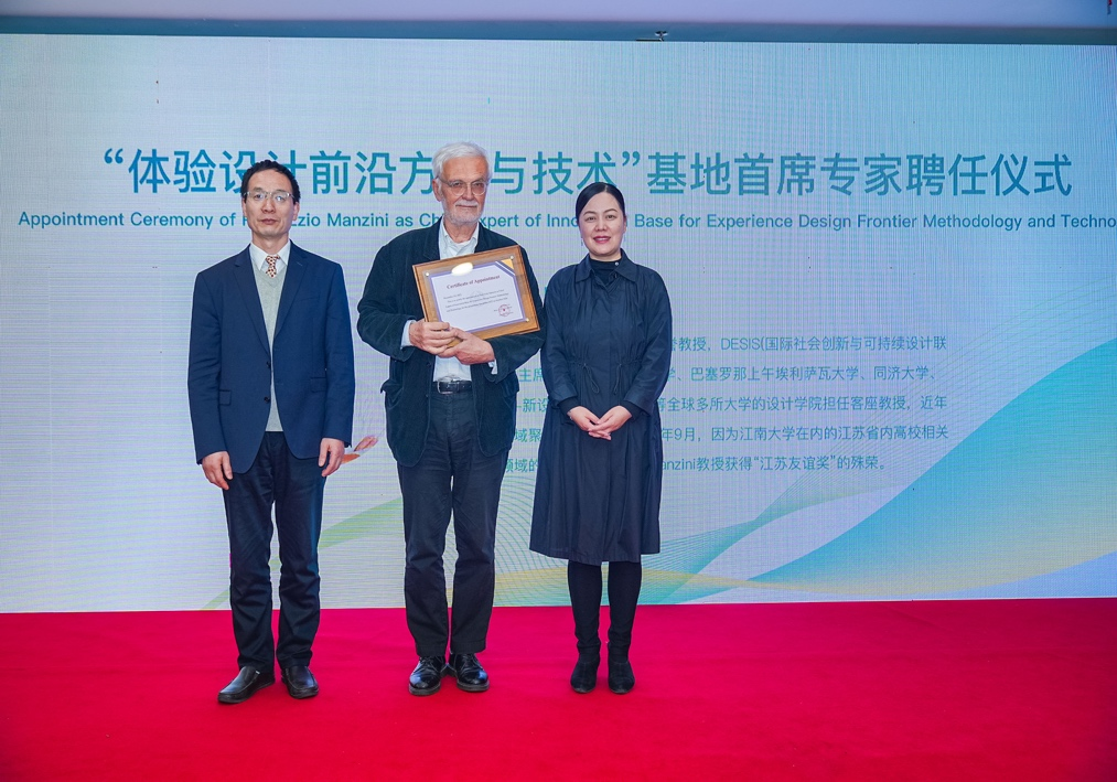 堵国成和魏洁共同为Ezio Manzini教授颁发“体验设计前沿方法与技术”学科创新引智基地首席专家聘书。