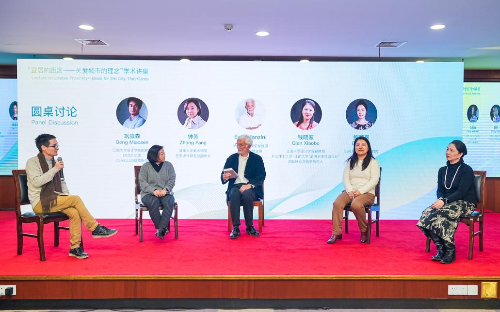 讲座结束后,与会嘉宾共同参与了圆桌讨论,回应了Manzini教授的讲座内容,巩淼森主持圆桌讨论。鲍懿喜认为,社会正在从机械化到动态化的转变之中,在这种灵活的设计机制里,设计师的职责更为重要。钱晓波指出,在老龄化日益严重的社会之中,我们需要思考如何帮助孤独的老年人融入属于他们的社交圈。她同时指出独立思考在设计生涯、学业生涯中的重要性。钟芳强调,设计的过程不是简单的用技术解决问题,更需要设计师将不同的人群带到研究之中。巩淼森从中国传统文化的角度分析认为工业化是一个反自然的现象,我们应当从儒家思想中得到启发,从最亲近的人身边开始关心。