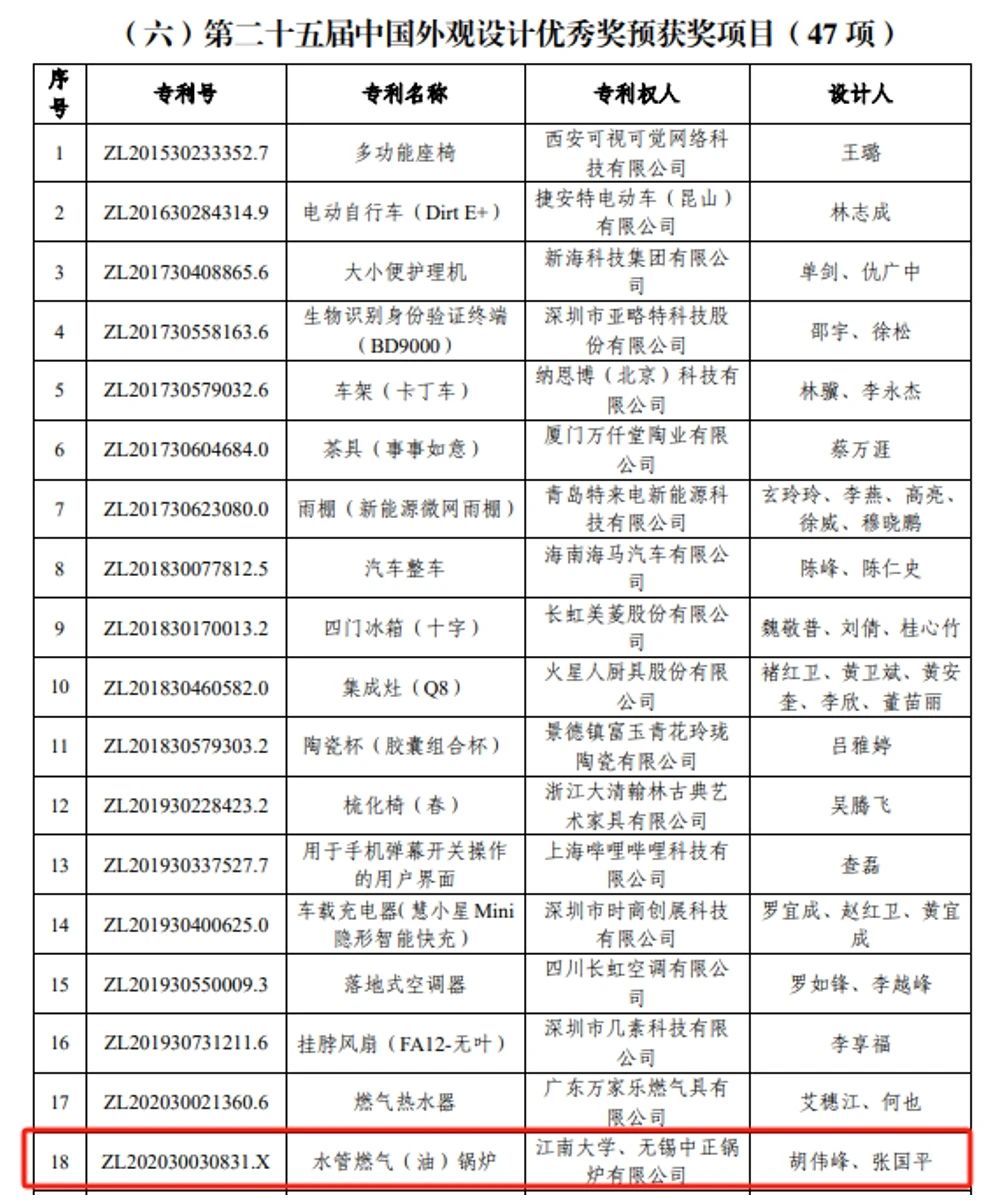 胡伟峰教授的“水管燃气(油)锅炉”外观设计专利荣获中国外观设计优秀奖。这是我校外观设计专利首次荣获中国专利奖,实现了新的突破。