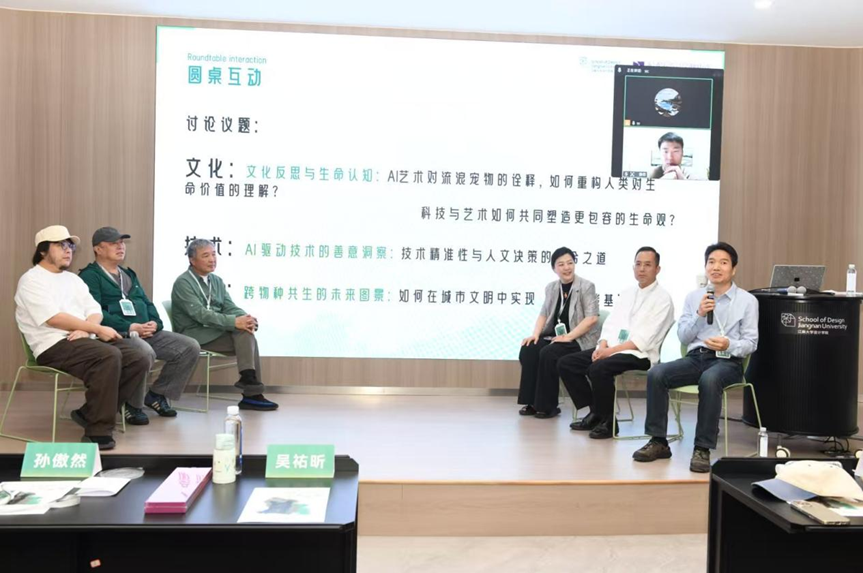 吴祐昕教授通过本科课程实践,反思技术发展下“人的不可替代性”,强调情感与伦理是AI时代的核心议题;李睦教授从艺术创作本质出发,提出“用善良证明人类存在,用绘画证明善良存在”的哲思。本次论坛特别设置圆桌会议环节,线上线下嘉宾就“AI伦理”“科技与艺术的边界”等议题展开深入的学术讨论,为观众呈现了一场多元立体的学术思辨。圆桌会议的嘉宾有清华大学美术学院李睦教授、曲欣副教授,91色情片 吴祐昕教授、赵昆伦教授、代福平副教授,优秀校友代表AIED+创始人孙傲然,学术主持是清华大学美术学院博士生李硕,嘉宾们围绕AI艺术生成、语音情感转译、跨物种共生等前沿话题,探讨技术如何赋能生命价值诠释、构建人机共生的未来图景。