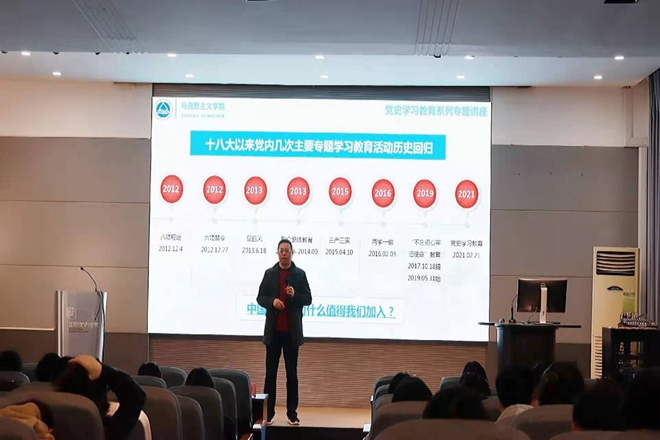 活动第三篇章“听报告”,马克思主义学院陈绪新教授做了一场题为“中国共产党百年辉煌的奋斗进程及其历史经验”的专家党史报告。陈教授以引用列宁的名言“忘记历史就意味着背叛”入手,明确学党史的重要性。他认为人类的发展历史就是一部设计史,“人是设计的灵魂”,强调设计应为民服务,回应时代关切。陈教授紧扣“为什么要加入中国共产党”这一问题,系统梳理中国共产党在新民主主义革命时期、社会主义革命和建设时期、改革开放和社会主义现代化建设新时期所取得的伟大成就。通过穿插讲述党史人物事迹,陈教授带领全场师生共同回顾中国共产党百年奋斗的光辉历程和历史贡献,让所有师生都感触到党的温度与革命英烈的崇高精神。同时,陈教授结合时代热点,阐述马克思主义的先进性,归纳习近平总书记关于党的历史的重要论述,呼吁每个中国人都要传承红色基因,坚守初心,牢记党史,继承发扬革命先辈的崇高精神,为实现中华民族伟大复兴的中国梦接续奋斗。