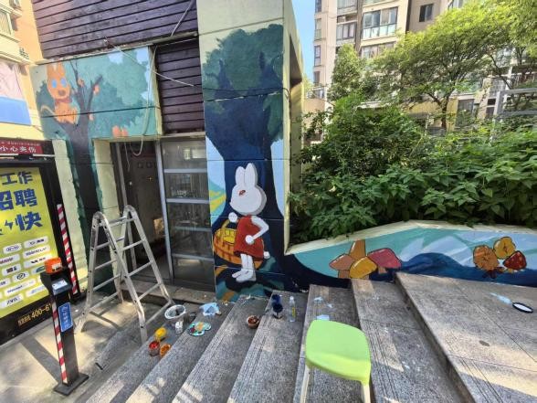 暑期烈日下,大家迅速分工,有的同学在墙上勾勒森林轮廓,有的调整动物的位置,还有的忙着调色备料。为了让主题完美呈现,同学们从线稿的3版调整到色彩的20多次调试,每一个细节都像对待宝贝一样精心打磨。比如“小松鼠熬果酱”的憨态和“小兔子采蘑菇”的灵动,每一笔都藏着同学们的巧思。为了让大家都能放心靠近,他们还特意选用了环保无味的丙烯颜料,既好看又环保,是不是超贴心! 阳光越来越烈,但墙面上的绿色也愈发均匀,同学们用细笔一笔一笔地勾勒小熊的绒毛,有人调色修补藤蔓边缘,还有人凑在一起检查整体效果。虽然汗水湿透了衣服,颜料也蹭得满身都是,但大家都乐在其中。夕阳西斜的时候,最后一笔画完,老墙瞬间变成了一个会呼吸的“童话森林”,晨光透过树叶洒在小动物身上,藤蔓间还藏着“小心心”,墙根的青苔也被染成了浅绿色,超美!原本灰扑扑的老墙,渐渐有了“森林”的模样。
