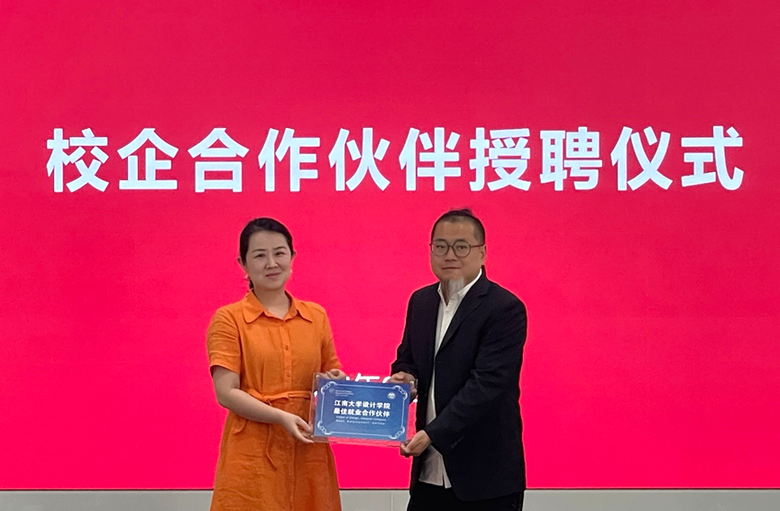 党委副书记、副院长江琳娜为企业代表:苏州市设计师协会副会长刘庆惠授聘“校企合作伙伴”证书。