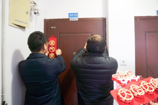 接着,老师们走进学生宿舍,和因疫情等原因不能返乡同学们亲切交谈,关心询问了同学们留校期间的学习和生活情况,老师们和同学们一起除尘布新,贴春联迎新春,交谈间“年味”至,“家”的温暖油然而生。