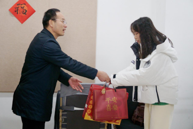 学院悉心准备慰问“红”礼包,包括“红”福、“红”包、“红”食,寓意鸿运当头,年味浓浓。在科研室,堵校长与留校学生进行了亲切交谈,深入了解每名同学留校原因、寒假在校安排以及生活困难等方面的情况。他表示,寒假期间遇到任何问题和困难,同学们要第一时间联系导师或辅导员,要继续保持疫情防控不松懈,合理安排好学习和生活,学校将尽最大努力为同学们提供帮助,使同学们能够欢欢喜喜在校过大年。