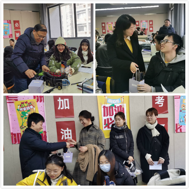 在A206学院考研自习室开展了2017级考研学生慰问活动。学院党委书记邱建平,学院党委副书记、副院长王晖、学院副院长曹鸣以及学工办辅导员老师们慰问正在辛苦备战的考研学子。