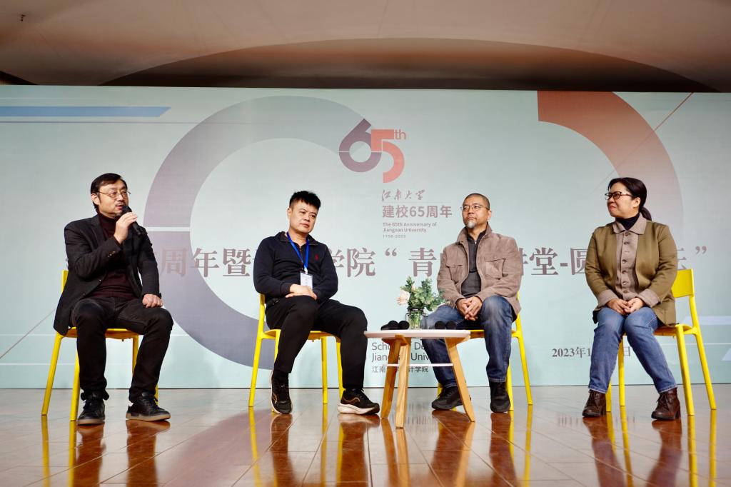 针对“在新时代背景下,设计学科会面临什么样的挑战呢?”议题,广州设计校友会会长兰和平、河南设计校友会秘书长王庆斌、大连设计校友会秘书长范一峰、北京设计校友会副会长聂茜分别讨论了自己的观点。兰和平强调市场的方向盘每五六年就会有转变,因此同学们的学习不仅仅停留在这四年时间,而应该是长久之计,日日为功;王庆斌回想起与江大的缘分感慨万千,面对2012年以来设计学科转向的大环境,他强调设计要综合多个学科,设计不是纯艺术专业,也不是纯工科专业,设计是创意与思维,理性与感性的整体融合;范一峰深刻剖析了技术变化对设计的影响,强调设计者应该更多关注社会变化,做贴近时代的设计师;聂茜建议学生们尽早进行学业规划,选对赛道,分析产业布局与地域资源情况,从而为更好的设计助力。