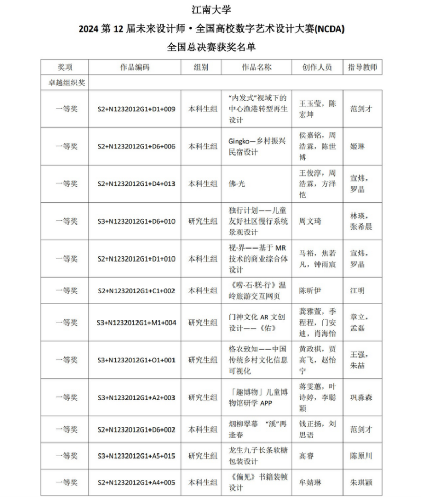 近日,由NACG办公室、各省赛区承办高校、上海工艺美术学会数字艺术设计专委会承办, “学习强国”学习平台、民政部直管智惠乡村志愿服务中心特别支持、与联合国教科文组织国际合作的未来设计师·全国高校数字艺术设计大赛(NCDA)国赛获奖名单正式公布。