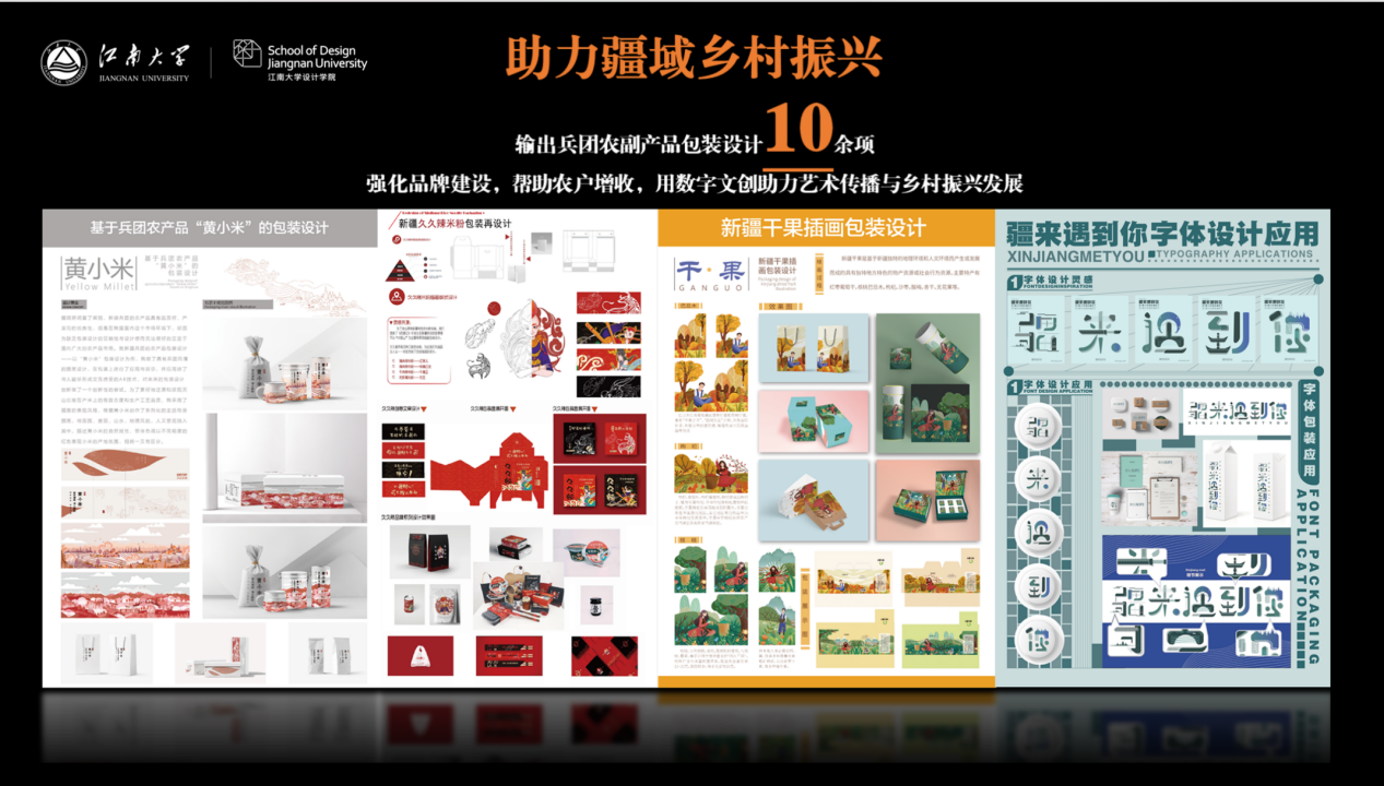 用设计服务“疆”域乡村振兴。2017-2020四年时间里,他多次带领团队深入南疆少数民族地区开展帮扶工作,用设计赋能乡村振兴。与四十七团农户建立联系,运用专业知识为当地农产品销售建言献策。他从改进农产品的创意包装设计入手,将其与新疆的艺术文化遗产传播有机结合,切实做到以数字文创助力艺术传播与乡村振兴发展。期间所设计的兵团黄小米、各类干果以及新疆米粉等包装设计被应用,拓宽了兵团农副产品的销售渠道,提高了销售额度。他利用自己在设计领域的专业优势,收集并记录边疆战士艰苦奋斗、屯垦戍边的红色记忆,以数字绘画的形式将其记录表现,旨在用设计的力量讲好兵团故事。