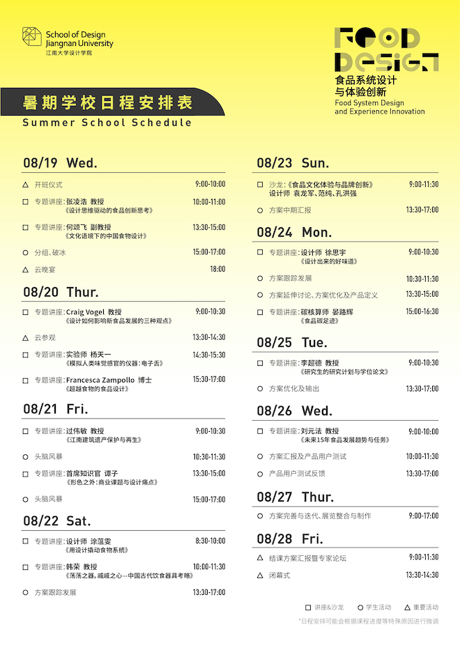 本次研究生暑期学校为期十天,将举办13场讲座、1场沙龙和1场专家论坛,邀请设计领域和食品领域的国内外知名专家学者进行设计方法授课、食物设计领域前沿案例分析,基于“食品系统设计和体验创新”这一主题开展深入的实践研究。