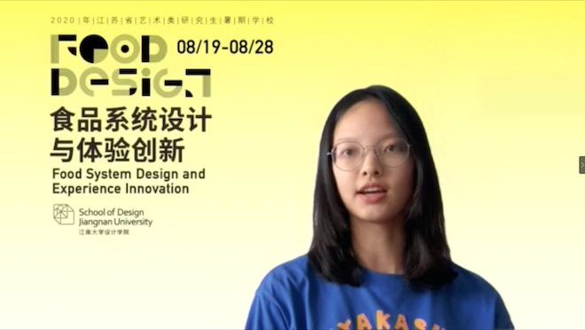 研究生曹菁菁同学作为暑期学校学员代表进行发言。她说到:“民以食为天,食物承载了历史时光隧道里最纷繁复杂的影像,了解一个国家的历史和未来走向,从舌尖上的设计开始,哪怕是管中窥豹,也未尝不可”。她同时也表示“食品+设计”这一跨学科、跨专业的融合让她对未来十天的暑期学校充满了期待。虽然疫情不能让大家面对面交流,但这并不妨碍大家在云端思维的碰撞、灵感的交流,这样特殊的经历也会成为大家弥足珍贵的回忆。
