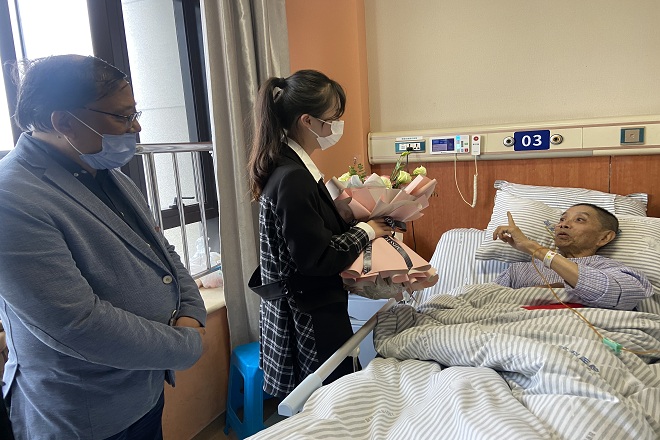 探望过程中,服装专业金倩同学代表全院学生向许恩源教授献花,并表达了将以许恩源教授等学院前辈们为学习楷模,在学术道路上砥砺前行,在使命责任上矢志奋斗。