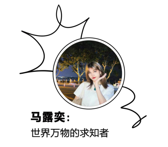 她想成为斜杠青年,设计师、导演、美食博主、咖啡店主.....她注重兴趣驱动,喜欢体验生活,不断尝试各种可能性,突破自己的各个边界。她是宿舍四人里的“生活设计师”。 “Study hard,play hard”是她对于工作和生活的态度。她认为,学习要刻苦,精神要愉悦,身体要锻炼。