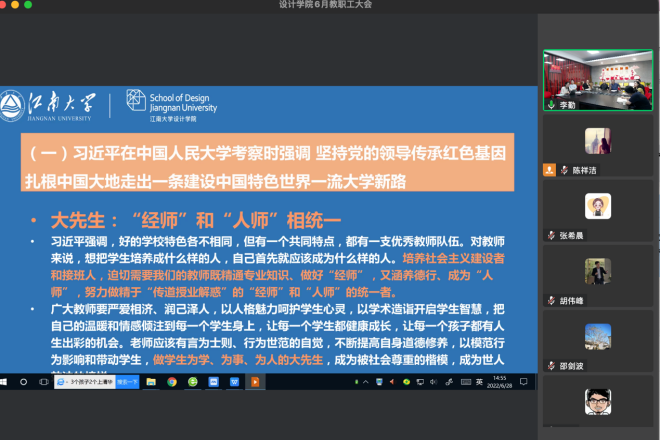 按照教职工政治理论学习和师德教育要求,邱建平书记首先领学了《习近平在中国人民大学考察时讲话》《习近平总书记在庆祝中国共产主义青年团成立100 周年大会讲话》《习近平给南京大学留学归国青年学者的回信》和《新时代的中国青年》白皮书等内容,要求学院全体教职工,深入学习领会习近平总书记系列重要讲话精神,落实立德树人根本任务,传承优秀中华传统文化红色基因,讲好课程思政,做到“经师”和“人师”相统一,带领带动广大青年学生坚定不移听党话、跟党走,努力成长为堪当民族复兴重任的时代新人。邱建平书记还传达了学校教材工作会议精神,通报了最新的疫情防控管理要求,并就近期学院教师职称晋升、人才项目、选派挂职等相关工作情况进行了通报。