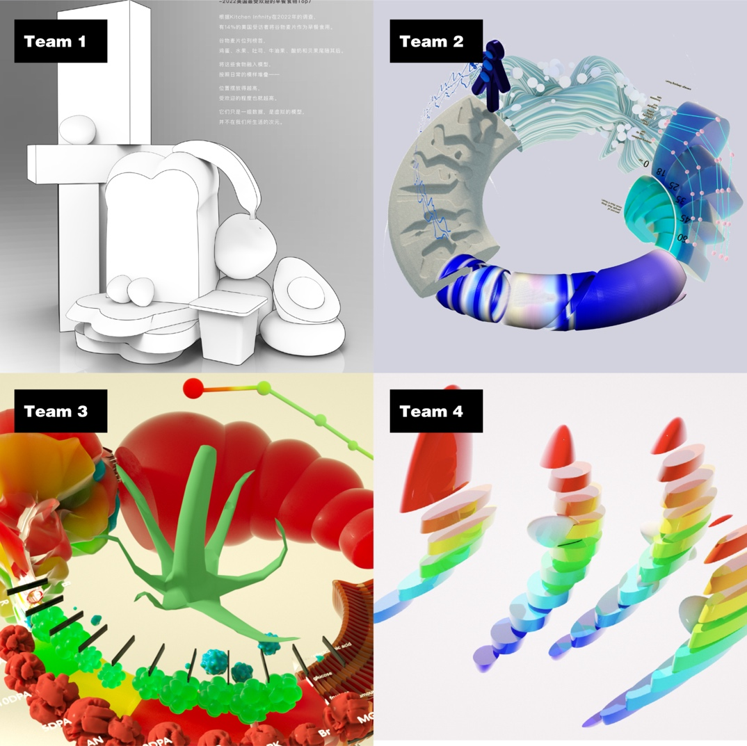 7月1日,四组同学分别展示了5天的设计成果,即包含16组变量的四个以甜甜圈为原型的数据模型。各小组成员跨专业跨语言团结协作,在主题的选定、变量的聚焦与提取和数据模型的转化阶段都展现出了充分的想象力和行动力。小组之间也在主题创意和数据理解上进行了广泛讨论和合作。Team1与Team4分别交换了“早餐”与“咖啡”两个主题的数据。Team2与Team3围绕“睡眠”与“番茄”两个主题开展了创意构想。团队成员各自发挥优势,步步推进模型,将数据对人们生活的影响生动具象地表现在三维模型上。双方教师对各组同学在本次夏令营中的积极表现给予了高度赞扬,并对同学们的合作与创意予以高度肯定。