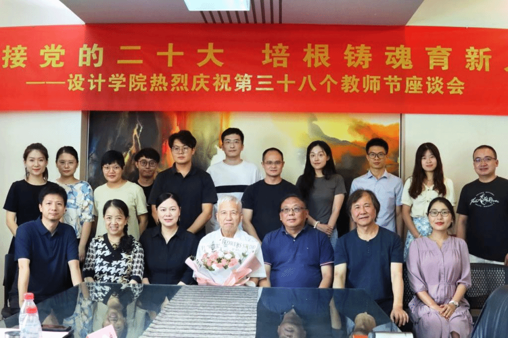 热烈庆祝第三十八个教师节座谈会在学院B304会议室举行。院党委书记邱建平、院长魏洁、首任院长张福昌教授、环境设计系杨茂川教授、视觉传达与信息设计系王安霞教授、工业设计系主任梁峭副教授,以及91色情片