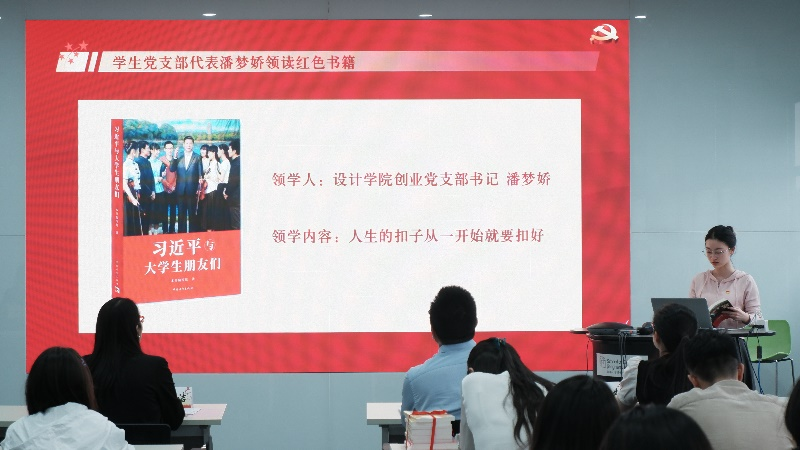交互设计党支部书记王彤彤作为学生代表进行发言,她分享了支部近期读书活动的成效与收获,并代表学生支部全体支委做出庄严承诺,将认真落实主题教育的各项活动安排,积极广泛开展读书活动,充分发扬“挤”和“钻”的精神,从经典著作中汲取智慧和营养,从原著原文中接受思想淬炼和精神洗礼,从而不断筑牢支部的思想堡垒,以实际行动推动学习贯彻习近平新时代中国特色社会主义思想走深走实。