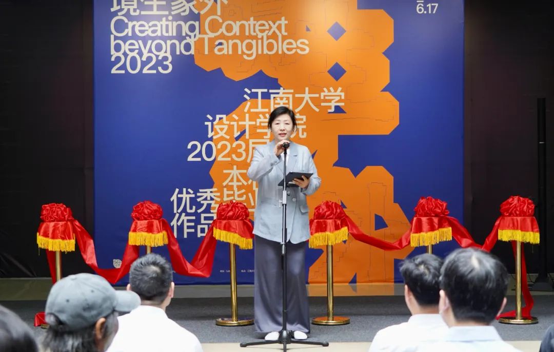 最后,吴宝锁副处长宣布2023届本科毕业作品展开幕,各位嘉宾和领导共同为毕设作品展开幕剪彩。相信此次展览会为学校师生交流增添新的色彩,也相信展览期间同步举办的高峰论坛会为学院设计领域学术交流和人才培养带来新的内容。