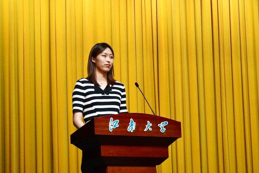 2021级设计学硕士生宋婉宁作为新生学生代表发言。她讲述了自己从大学前四年的金牌“0”入账,最终到全国比赛夺冠的经历,鼓励新生直面挫折,拥抱失败,培养向下扎根的定力。她表示“服务社会,造福于人”才是设计存在的最初意义与价值,要勇于担负起“设计改变现在,设计创造未来”的责任和人文情怀。