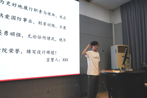 在数艺2203班翁力川同学、视传2203班林晓榕和美术2202班逄志贤同学的带领下,全体学生举起右拳,郑重宣誓。“热爱祖国、热爱人民、热爱国防事业,刻苦训练,不畏艰辛,苦练军事本领……”誓言声声,充分展现了同学们斗志昂扬的精神风貌和刻苦训练的坚定信念,也一定能用汗水见证成长,用青春书写华章。