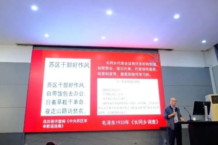 刘老师带领大家共同回顾上世纪二十年代两个联合革命的政党—共产党和国民党的历史发展,着重分析了国共两党对民众的态度,通过史料、歌谣、相关文献等向同学们展示了国共两党对立的群众观,进一步明确了中国共产党始终把人民放在心中,始终把人民群众的利益放在首位,坚持一切为了群众,一切依靠群众,牢固树立全心全意为人民服务的宗旨,这也是无产阶级政党区别于其他政党的显著标志。同时,刘老师通过对比国民党的群众观,指出资产阶级政党的阶级属性意味着他们不是把自己当作人民群众的工具,而是把人民群众当作自己的工具。随后,他从国民党群众观、社会基础薄弱、国民党未能解决人民利益关切三方面深刻剖析国民党失败的原因,点明了国共两党对民众的不同态度决定了国共两党的不同命运。