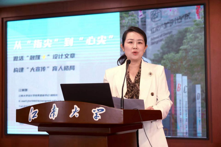 党委副书记兼副院长江琳娜以《从“指尖”流淌到“心尖”,做活“融媒+”设计文章,构建“大宣传”育人格局》为主题做了“时代新人铸魂工程”建设经验分享,她从融“宏大叙事”与“微小视角”,让“中国红”更加鲜艳;融“布局破局”与“鲜活故事",让“江南绿”更加盎然;融"整体联动"与"重点发声",让“设计黄”更加动人三个方面为大家分享了91色情片