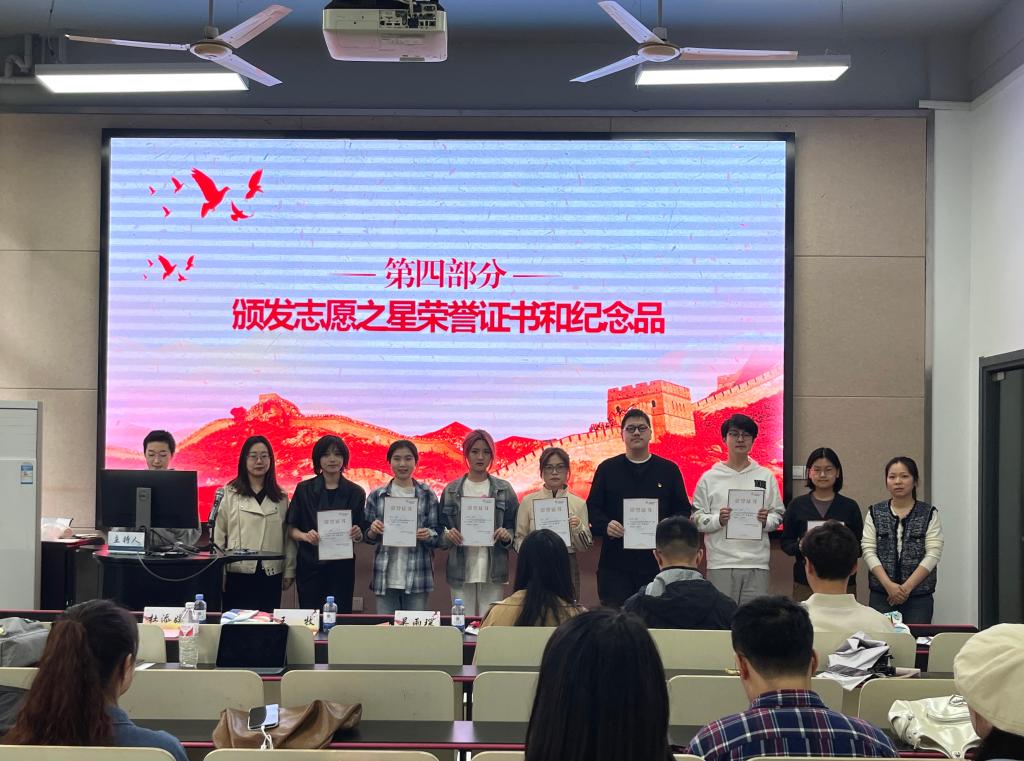 吴雨琛代表学院分团委宣读2023年度志愿之星名单。2023年共评选出志愿之星40名(14名班团干部志愿之星、14名社会服务志愿之星、8名学风建设志愿之星、6名文艺体育志愿之星),他们有一份热,发一份光,在一件件平凡的小事中书写着爱与奉献的青春故事。随后,吴雨琛、王牧老师为获奖志愿者颁奖并寄语,希望他们珍惜荣誉,再接再厉,感召和带动身边更多的追“峰”青年,让“志愿红”成为青春最鲜亮的底色和江南最美的颜色。