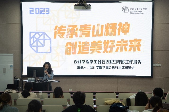 “培养引领中国未来发展的设计力量”的院训,强调全心全意服务同学的学生会工作宗旨,同时发扬设院的创新力、想象力、执行力。然后从树立思想明灯,引领青年方向;加强榜样引领,服务成长成才;打造品牌活动,畅通宣传合作这三方面对2023年度工作进行了工作报告,详细阐述了学院学生会的组织架构体系和品牌特色活动。