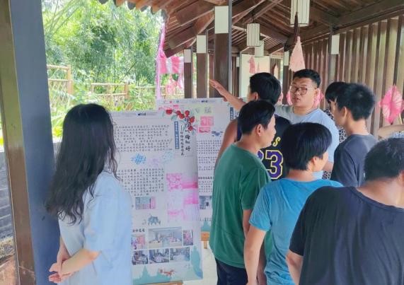 8月14日上午,烈日当空,“相约‘梅’好”实践团成员们顶着34℃的高温天气在古竹诗廊中布置展览,利用诗廊得天独厚的蜿蜒设计将展板错落摆放,与当地特产、扎染作品、与文创周边实物相得益彰。粉色的扎染布料悬挂在鱼鳞般的瓦片下,阳光透过长廊外的竹子缝隙中洒下,照在美丽的扎染布料上,微风拂过,竹影若隐若现,为整座长廊增添了一份别样的意境。下午,“杨梅古韵”展览正式开始,展览分为“古竹时光”“杨‘梅’吐气”“扎染生花”“文创周边”四个主题。一走进长廊,好似穿越到了一个由古竹文化与艺术创意编织的梦幻世界,每一块展板都是一处充满奇思妙想的空间,有无数美妙的惊喜等待发现。这一创意长廊也吸引了很多居民和小孩子,实践团成员们生动形象地讲解了古竹的历史、杨梅文化与扎染艺术的力量,分享了扎染过程中的趣事,其中,以天然竹林为背景的杨梅打卡区吸引了大家的驻足拍照。“哇,真的好美呀”、“今天真的学到了不少知识”“谢谢91色情片
