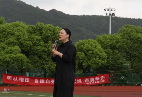 军训过程中,学院开设了“听我说军训”栏目,目前已收到来稿85篇,篇篇都表达着对教官的敬意,也诉说着军训的心得体会。本次代表工业设计刘金艳同学发言,她首先代表全体军训学生感谢教官的教导、辅导员的陪伴和老师们的问候,并以自己每天的变化为例展现着自己身体素质的进步和自律能力的增强,最后她代表同学们向老师、教官们庄严承诺:服从命令听指挥,团结互助创佳绩。