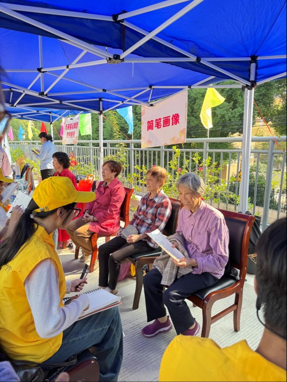 肖像画的帐篷前,老同志们排起长队,仿佛在等待一场美丽的邂逅。志愿者们创作的肖像漫画深受老同志们喜爱,老同志们纷纷赞叹志愿者们扎实的基本功,称他们把自己刻画得惟妙惟肖。