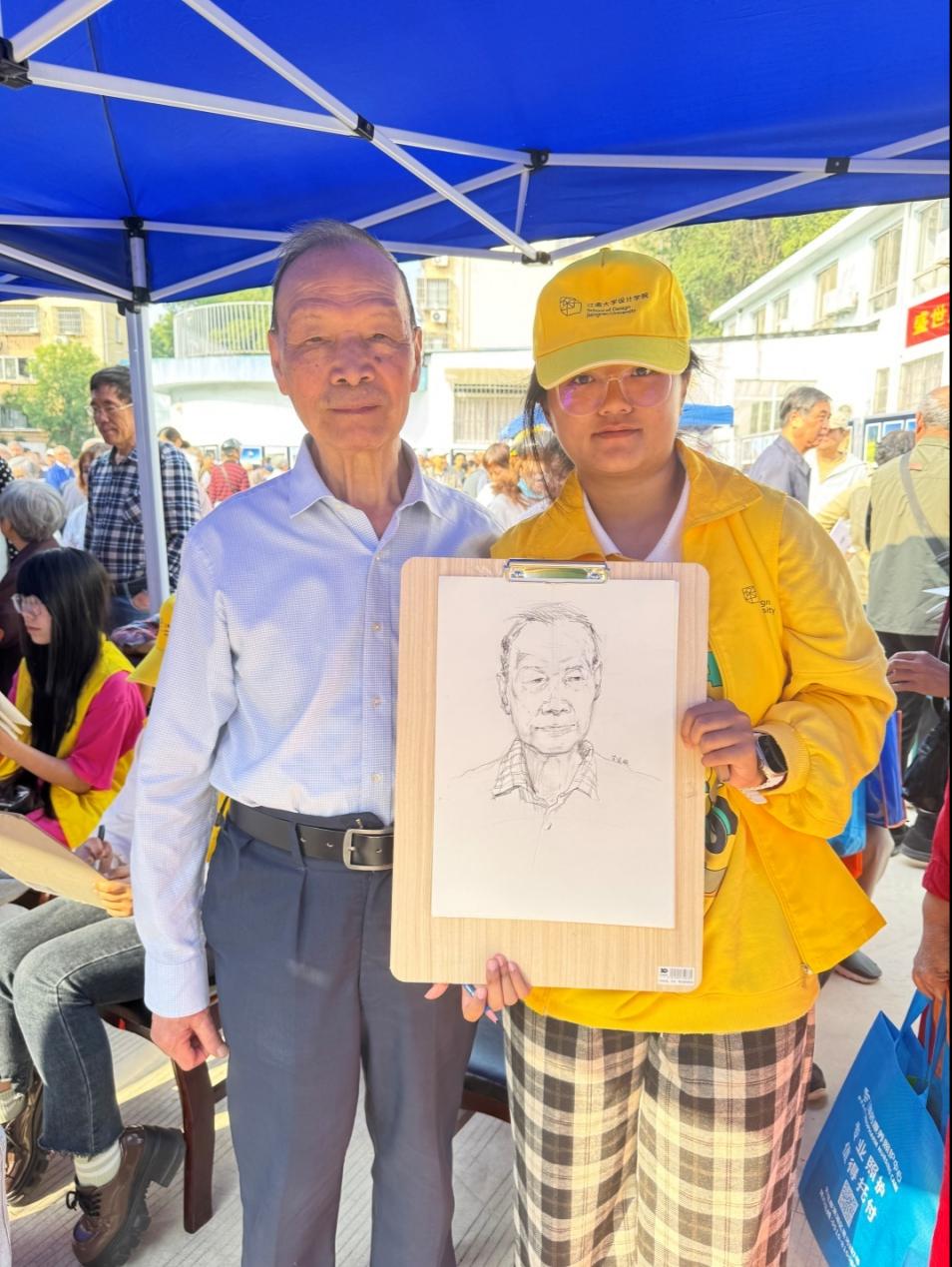 没多久,老同志们就拿到了自己的肖像画。看着画中的自己,老人们脸上绽放出幸福的笑容,纷纷拍照记录。有的老同志说:“同学们太厉害了,画得很生动,我都变年轻了!”还有的老同志感慨道:“我就是冲着画像来的,以前从来没体验过,这次活动真好,这就是在关心我们老年人啊!”