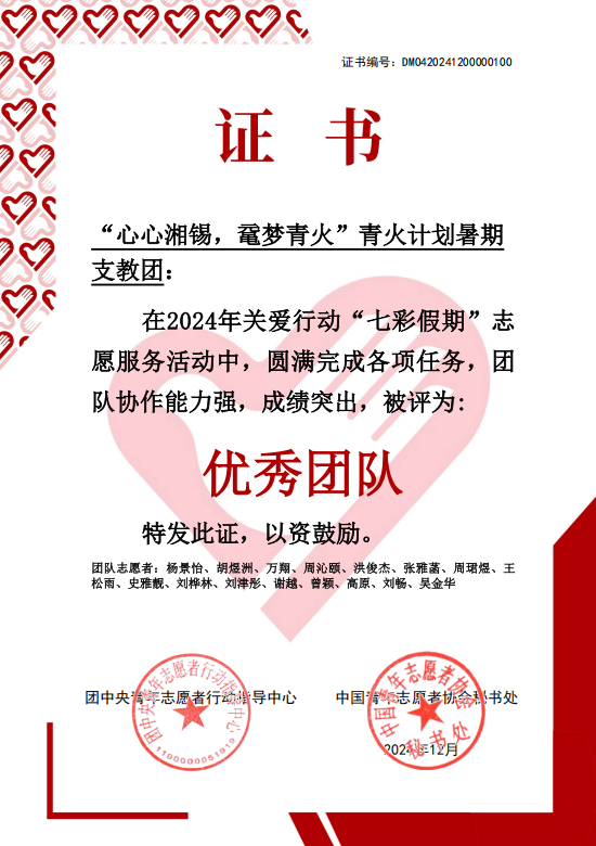 为深入学习宣传贯彻习近平新时代中国特色社会主义思想和党的二十大精神,切实加强对农村留守儿童、寄宿儿童、困境儿童等少年儿童群体的关心关爱,组织动员青年志愿者以实际行动投身中国式现代化建设,团中央青年志愿者行动指导中心、中国青年志愿者协会秘书处发布了《关于遴选2024年关爱行动“七彩假期”志愿服务团的公告》,该团队成功入选并在此次全国评选中获得“优秀团队”荣誉称号。
