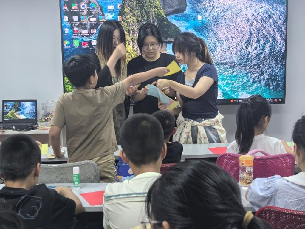 实践团围绕“艺术创作+环保教育”双主线,精心设计两大特色课程模块。活动首日,孩子们围坐在铺着彩纸的工作台前,目光被桌角一堆“特殊材料”吸引——那是同学们特意收集的废旧报纸、杂志内页、快递盒边角料。在“书签里的生态世界”作坊中,孩子们用废旧报纸、干花和彩笔创作出独一无二的书签,将“变废为宝”的循环理念化作指尖的艺术。在同学们的引导下,孩子们将旧纸裁剪、折叠、熨平,再用干花点缀、彩笔勾勒,不一会儿,一张张承载着旧时光与新想象的书签便诞生了。看似简单的书签制作,藏着最朴素的环保课。“我们特意强调‘变废’为宝”,就是想让孩子们知道:旧物不是垃圾,而是放错位置的资源。带队同学说。当孩子们举着自己的作品互相展示时,“节约”“循环”的种子,已随着指尖的温度,在他们心里悄悄发芽。