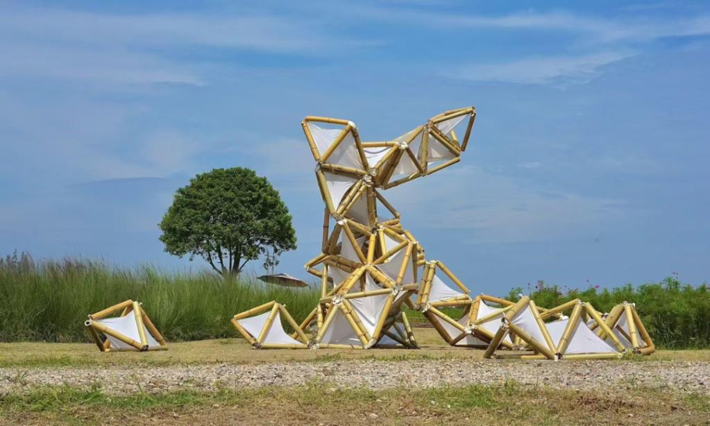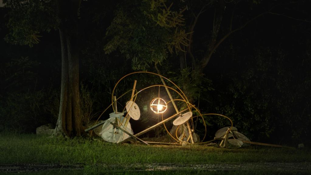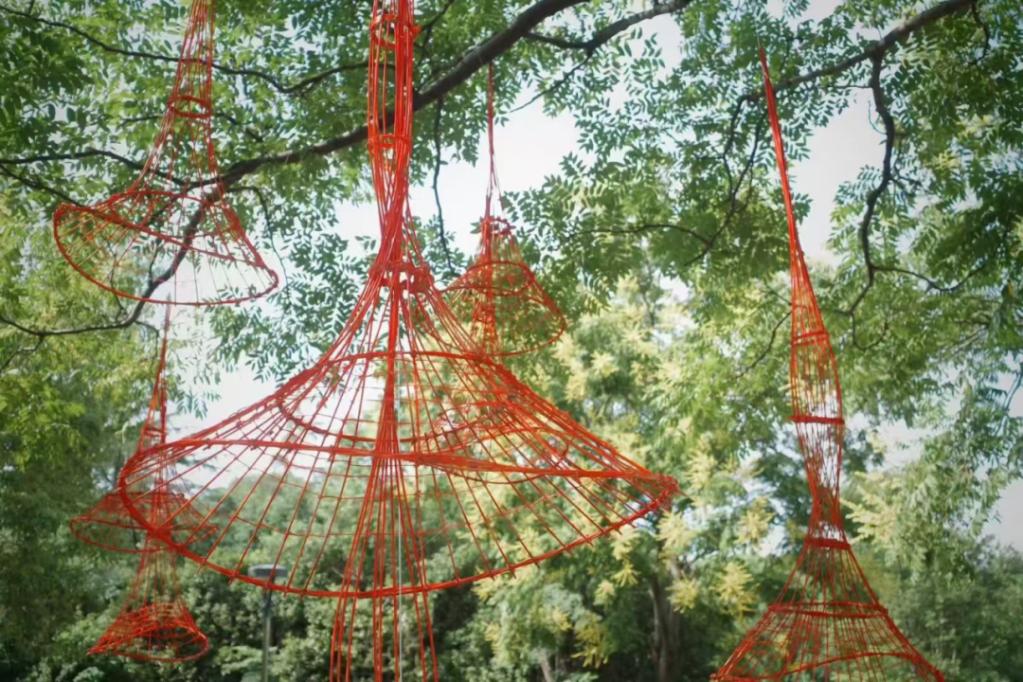 《竹影坠梦》装置的形态灵感直接来源于璜土村最著名的物产——葡萄。作品提取了“葡萄串”这一垂坠意象,将其转化为竹编的艺术语言,一共编织了十一个单体,分为大中小三个形态,再将其组合成六组不同大小的竹编串,用这些手工编织的单体组合模拟葡萄果实的自然聚合与藤蔓的有机生长,仿佛是树木本身结出的艺术果实。装置置于璜土村农民公园湖边村民和游客日常经过的树下,旨在打破艺术与生活的界限,邀请人们进入一个由竹影、光斑和微风共同编织的沉浸式场景。让艺术以一种轻盈而深刻的方式介入乡村,不是生硬的移植,而是有机的生长。