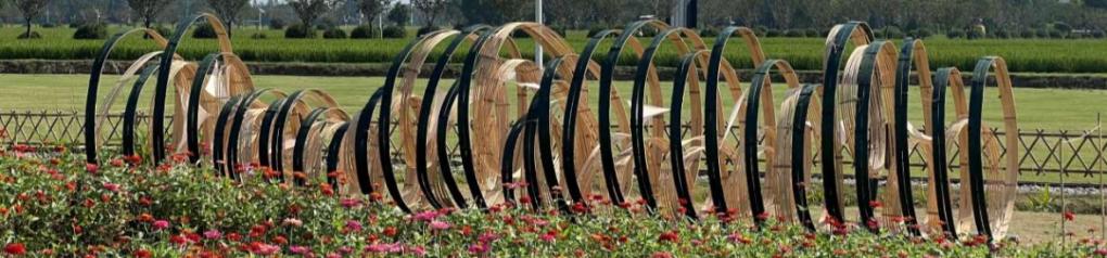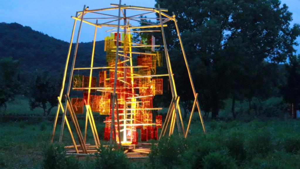 《映月荷》创作灵感源于璜土村独特的艺术气质与江南水乡风貌,将传统书法的写意精神与水、荷的自然意象相融合,就像乐府诗集《江南》中所描述的,江南可采莲,莲叶何田田,鱼戏莲叶间。作品以写意的竹条来表现中国书法的文化底蕴;以波纹不锈钢板的流动线条展现水乡的柔美;以穿孔金属板作为荷叶的形态点缀,增添灵动生机。以竹编灯笼代表月光,整体营造出月夜下荷塘粼粼的场景。