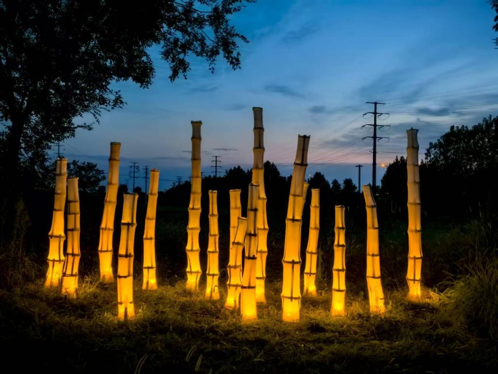 《素帷竹影》以富安村“状元文化”为创作内核,提取“竹节”作为核心视觉元素。竹挺拔向上,暗合状元勤学登科之志,取“节节高升”之美意。装置以竹节为韵,气骨为魂,通过律动性的竖向叠砌,构建出疏密有致、高低错落的现代竹群意象,再现状元古道文脉记忆。日间为庭间雅景,入夜则流光温润,如先贤智识朗照乡野。