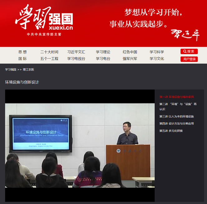 《环境设施设计》是中国大学MOOC平台的“国家精品在线开放课程”,自2017年初次开课,本次已是第十三次开课。该课程在MOOC平台口碑佳,学生满意度好,已吸引2万7千多名学生通过该平台参与本课程的学习。同时,课程作为优质慕课资源,被推荐并成功上线于“国家高等教育智慧教育平台”和“学习强国”学习平台。