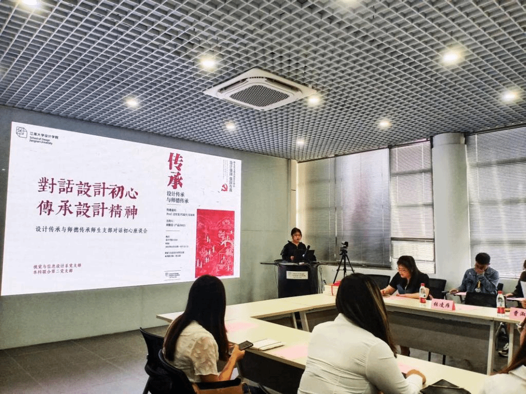 视觉与信息设计系党支部、本科联合第二党支部“对话设计初心,传承设计精神“对话初心座谈会在C510会议室举行。视觉与信息设计系党支部书记吴祐昕,视觉传达专业教授过宏雷、代福平,本科联合第党二支部书记张凌雁,分团委副书记曹淑慧等部分教师党员代表、学生党员共同出席主题分享座谈会。
