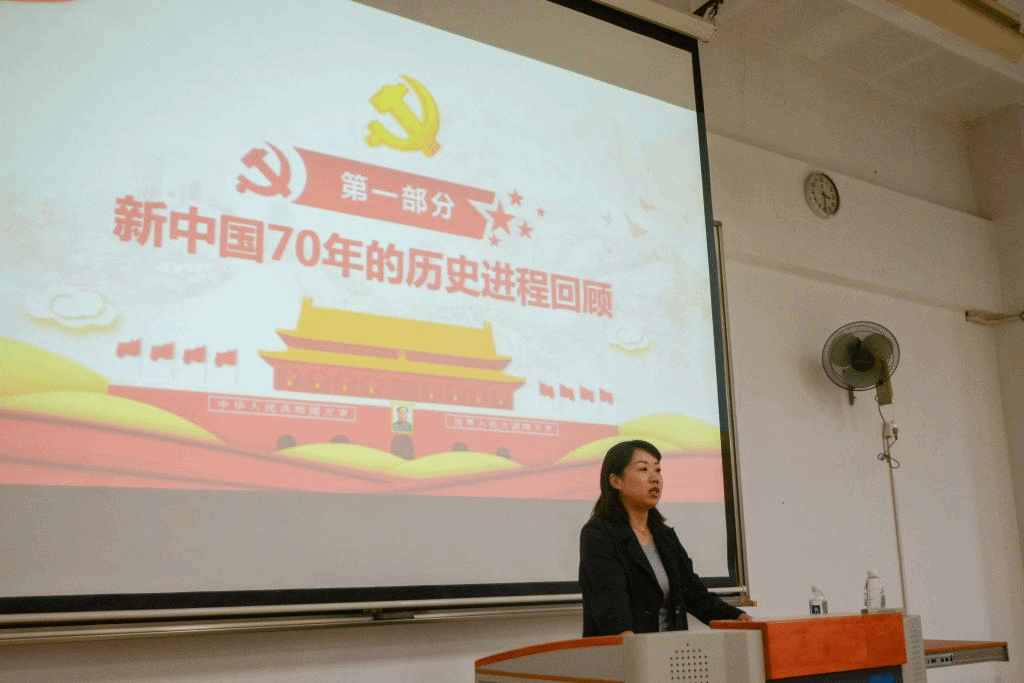 王书记首先和新生一起分享中华人民共和国成立70周年的历程,她通过一张张图片讲述一段段故事,鲜活地将中华人民共和国成立70周年的成长展现在同学面前,激发新生们爱国之情,也加深他们对新中国繁荣强盛的信心。