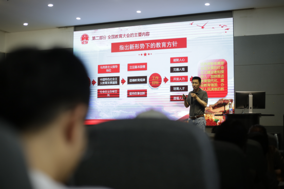 戴月波从最近的热点话题“中美贸易战”切入,引出“不忘初心铸伟业—聚焦全国教育大会宣讲”的主题。他强调,以习近平同志为核心的党中央情系教育事业发展、关注青年人才培养。通过带领同学们回顾改革开放以来党中央、国务院召开的四次全国教育工作会议,戴月波指出每一次全国教育工作会议的召开都是在深入研究当时教育工作面临的形势和任务的前提下对当前和今后一个时期教育改革发展作出的战略部署。随后,他结合2018年全国教育大会,从一个根本任务,一个重要目标,九个坚持,六个下功夫等方面诠释了新时代人才培养体系的新要求、新方向。在谈到深化教育体制改革的问题时,戴月波表示高校不仅要从健全立德树人方面落实机制,扭转不科学的教育评价导向,更要坚决克服唯分数、唯升学、唯文凭、唯论文、唯帽子的“五唯”顽瘴痼疾,从根本上解决教育评价指挥棒问题。在谈到91色情片