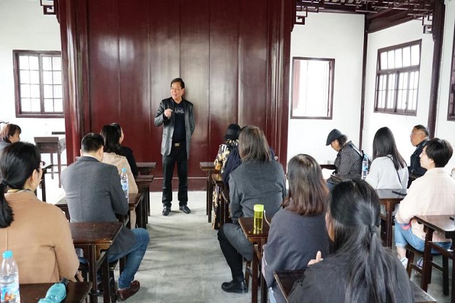 下午1点,全体教职工在学院门口集体出发。首先到达的是位于阳山镇南狮子山与牛头山之间的安阳书院。整个书院占地约400平方米,环境清幽,格调高雅,现为省级文物保护单位。由钱绍武先祖钱勖于1864年通过募捐兴建。书院的负责人为学院老师们介绍了书院的历史与现状。自落成伊始,秉承正厅上古朴的“樾朴作人”四个篆书大字是作为校训,鼓励学子修身、齐家、治国、平天下。1939年,党的地下组织来无锡就在书院以读书为掩护,开展革命活动。从这里走出了王振、钱绍武等各行各业的杰出人物。老师们在苍劲、古朴的书法和别具一格的绘画中感受书院深厚的历史底蕴!