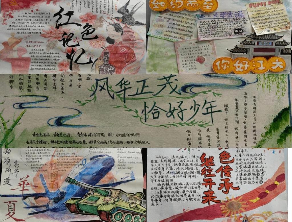 活动开始之前,同学们精心绘制了以主题一:风华正茂,恰好少年(青年)主题二:红色传承,既往开来(红色),主题三:吾有所爱,其名华夏(红色),主题四:如约而至,你好江大(校园)4个主题的手抄报,展示自身对爱国主义、理想信念、青春奋进与美好校园生活的感受。